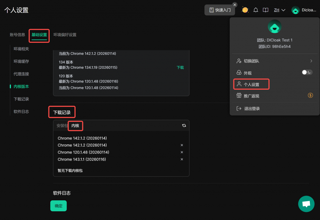 - 您还可以在【个人设置】-【基础设置】中查看内核的下载记录