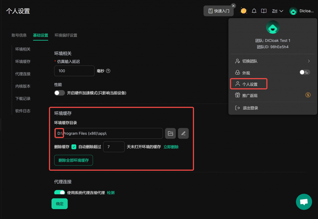 - 更改DICloak文件缓存路径:在Dicloak-个人设置-基础设置中,将环境缓存目录路径改为其它磁盘