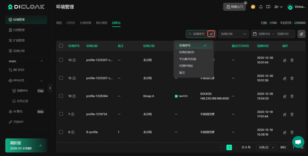 回收站会保留您已删除的浏览器环境。在回收站中你可以恢复或彻底删除已删除的环境,其中恢复功能只支持付费套餐的用户使用。