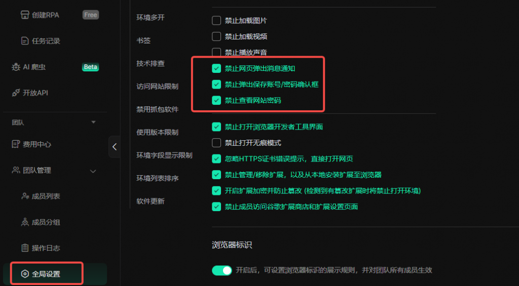 前往全局设置,开启禁止查看密码和禁止弹出保存密码的弹窗等功能