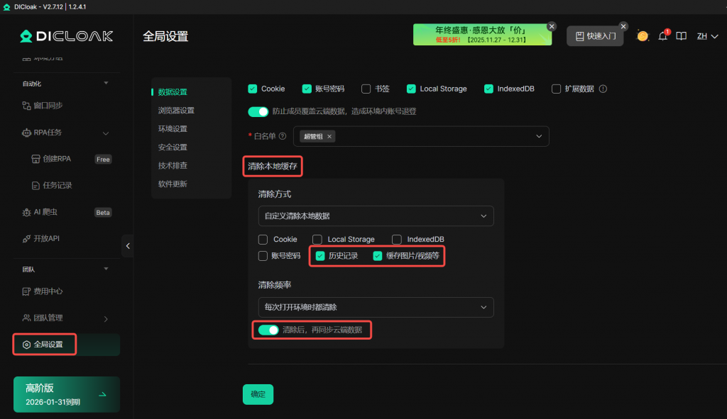 进入【全局设置】,设置清除本地缓存板块,勾选“历史记录”和“缓存图片/视频等”。该功能打开后,成员打开环境时将会自动清除设备本地的历史记录和缓存图片/视频等。