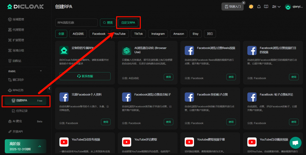 您可进入【创建 RPA】界面,点击【自定义 RPA】,即可进入 “自定义 RPA” 创建界面。