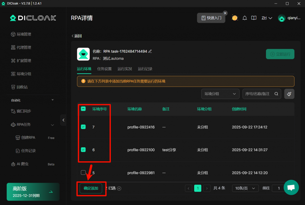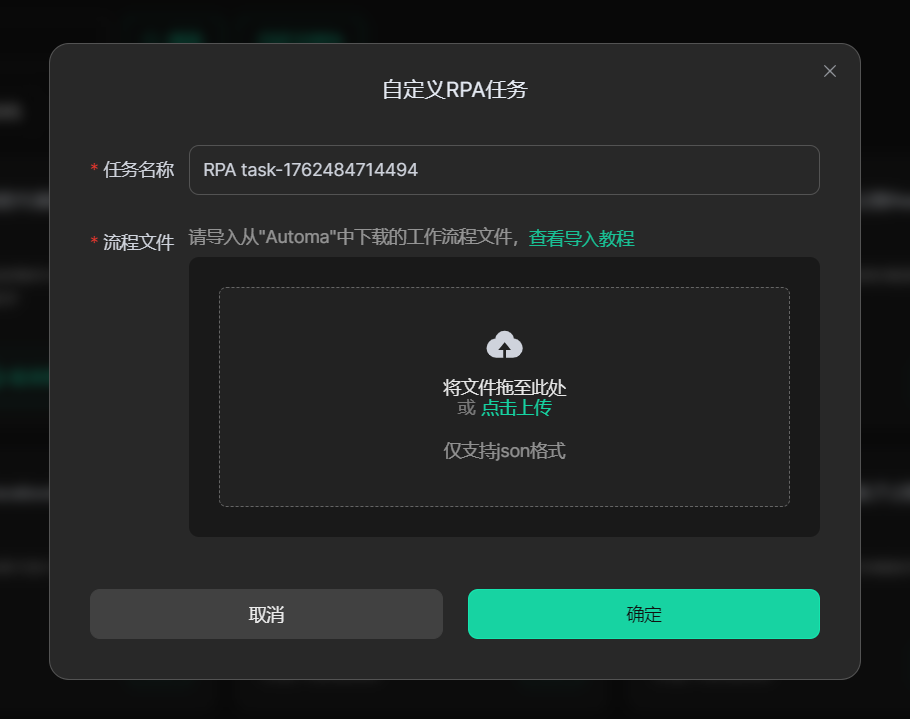 在”自定义RPA任务”创建界面,您可填写”任务名称“,并且导入从”Automa”导出的流程文件,点击【确认】,进入”RPA详情页”。