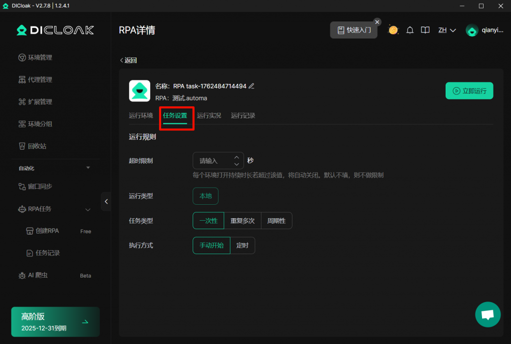 在”任务设置”模块,您可编辑当前任务的运行规则,具体参数使用教程,可点击查看。完成设置后,点击【立即运行】。
