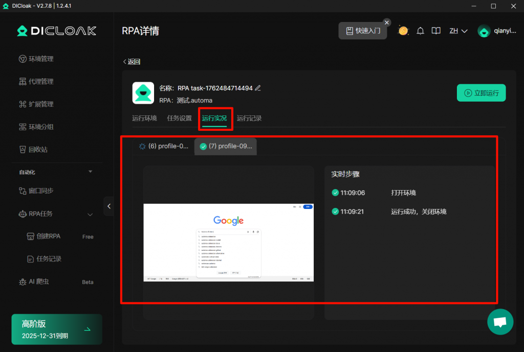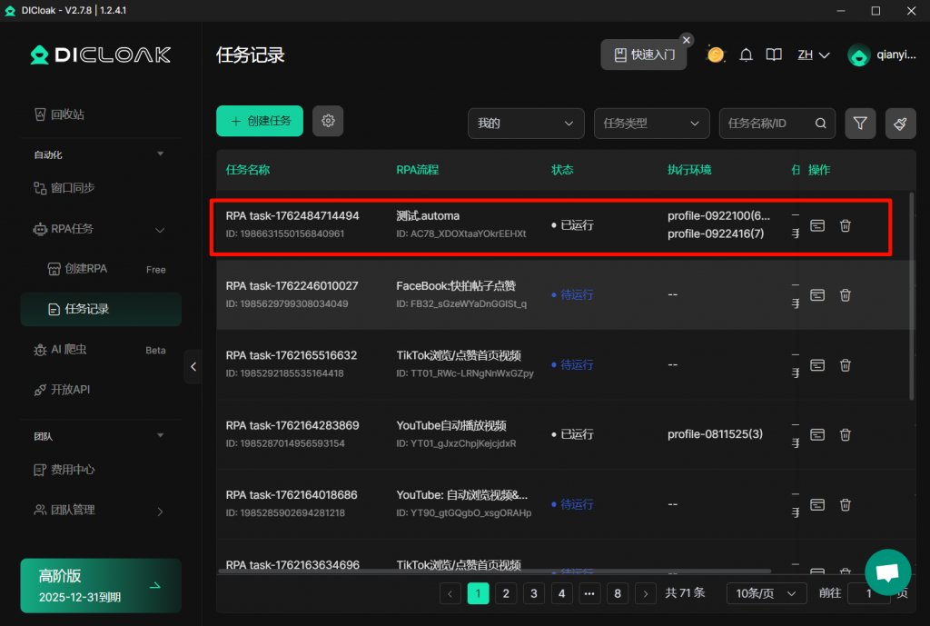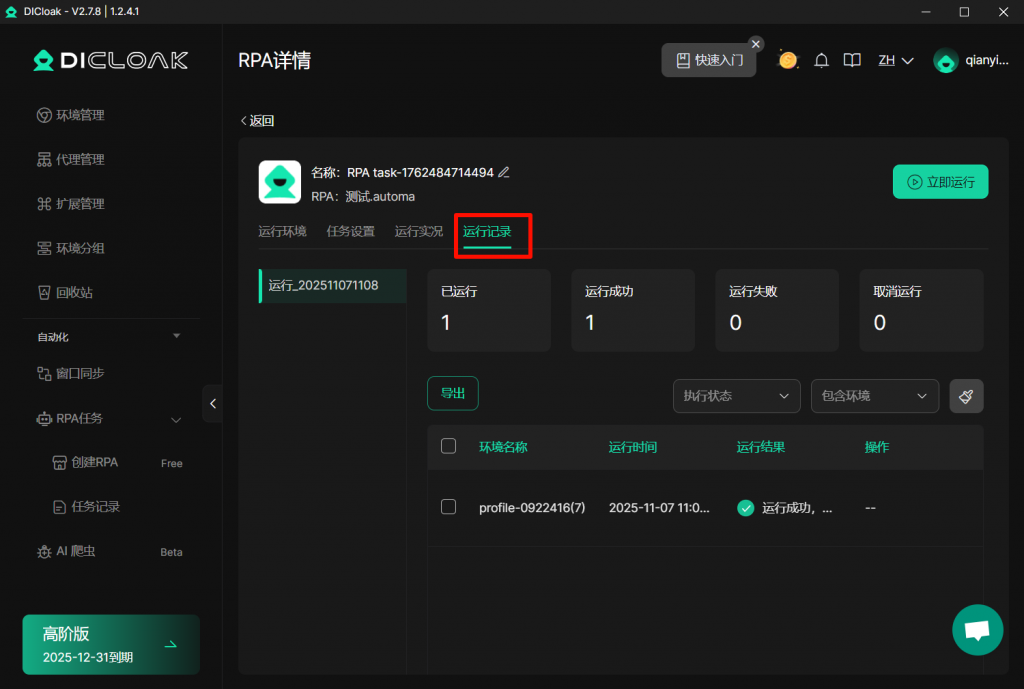 另外,您可在【任务记录】界面,查看自定义的RPA任务。