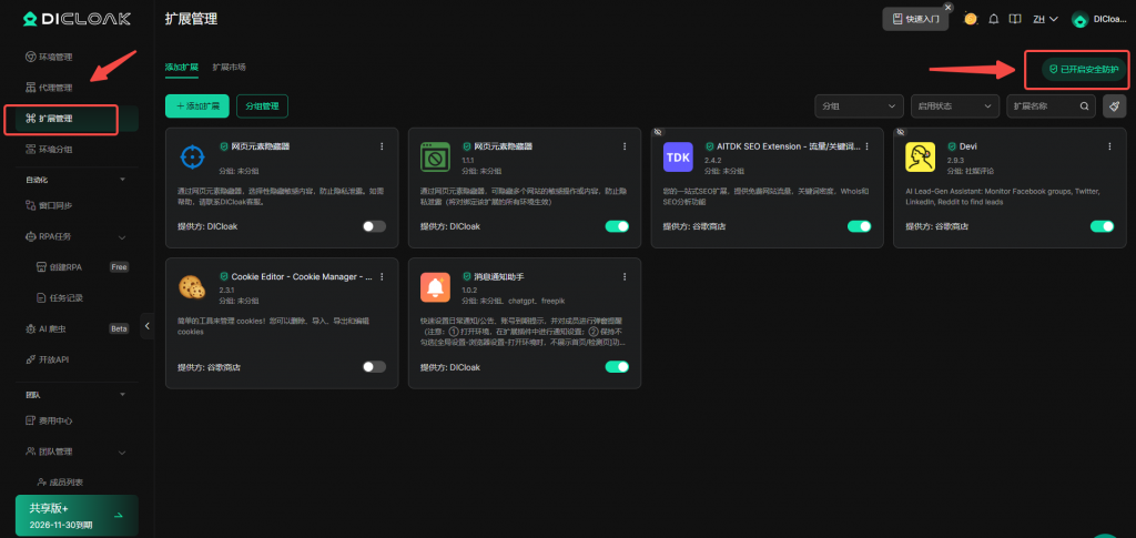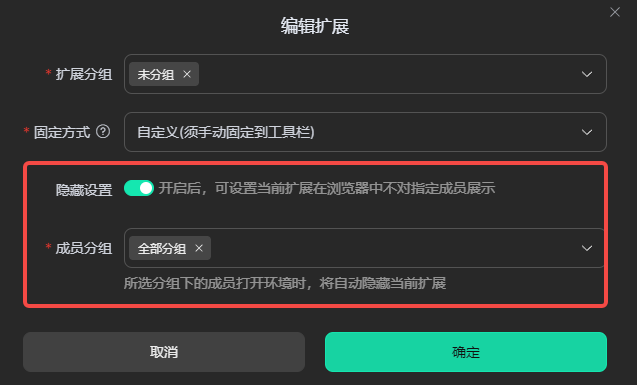 - 隐藏网页上扩展工具的展示,禁止成员前往管理扩展的页面查看、编辑扩展