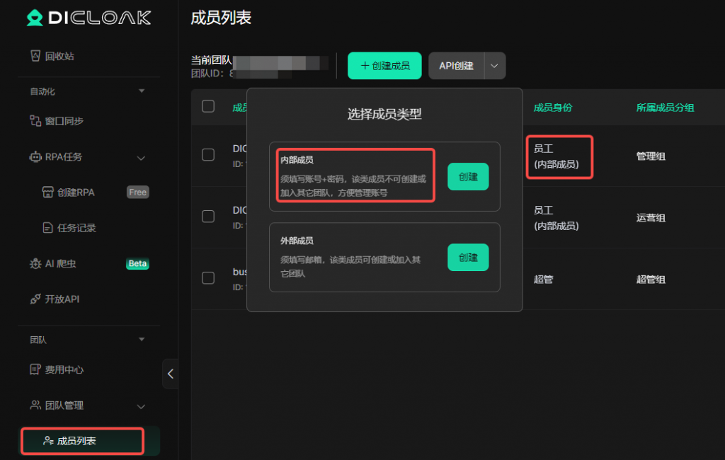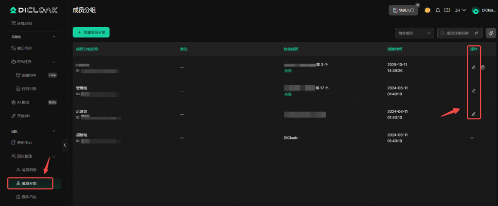 - 前往成员分组列表创建对应的成员分组并设置成员使用权限