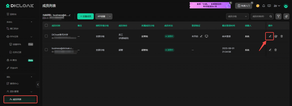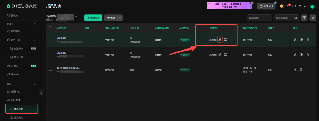 - 前往成员列表,找对要设置2FA验证的内部成员账号,找到登录验证,点击编辑按钮,然后开启2FA验证即可