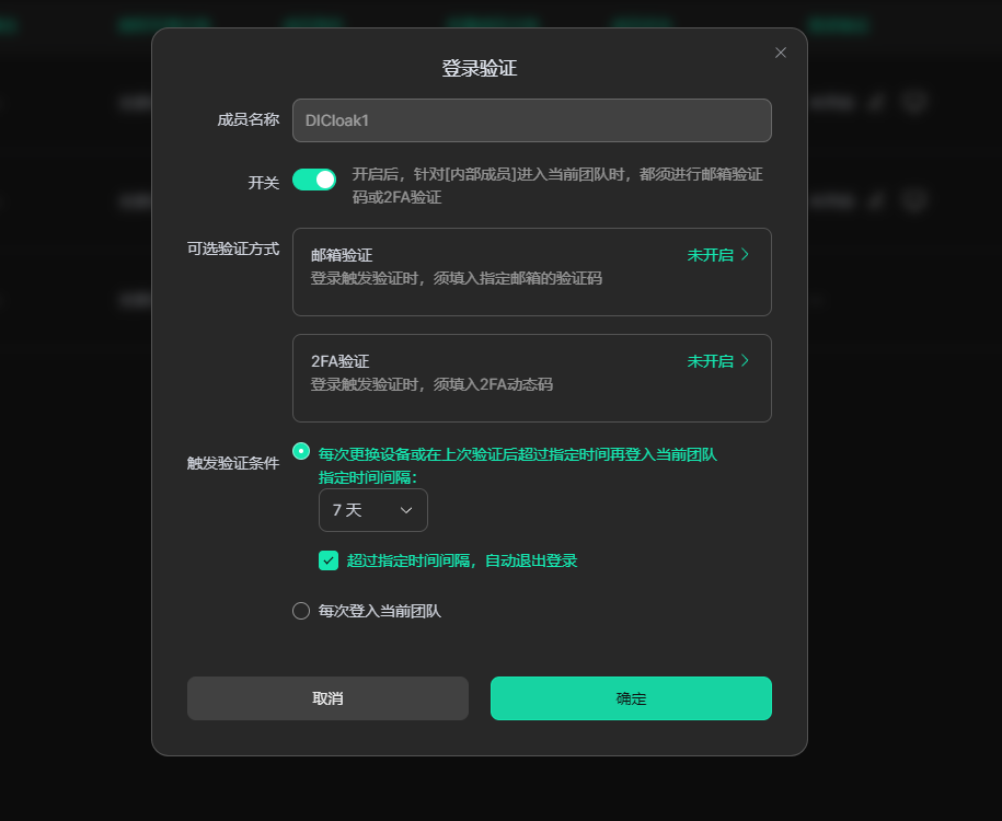 重要提示:目前只支持为内部成员设置2FA验证。如果您使用2FA功能,那么您的成员在新设备登录时,需要联系团队管理员获取2FA验证码登录,该功能可以避免成员随意分享登录账号信息