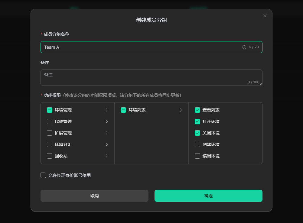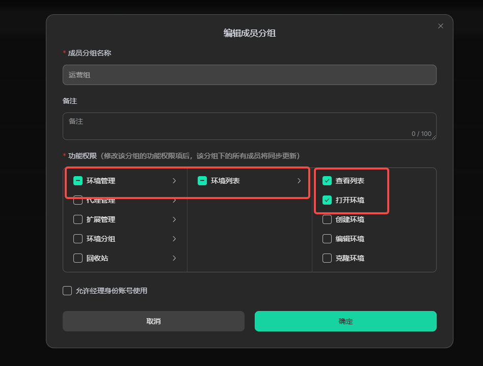 - 只为成员分配两个操作权限:【查看列表】和【打开环境】,并取消勾选其他功能权限