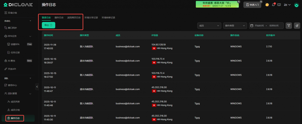 DICloak提供登录日志、操作日志、浏览网页日志并支持导入日志数据、让管理员清晰了解成员的设备登录情况、在软件上的操作情况以及日常浏览网址的情况,及时发现进行异常操作的用户并采取管理措施