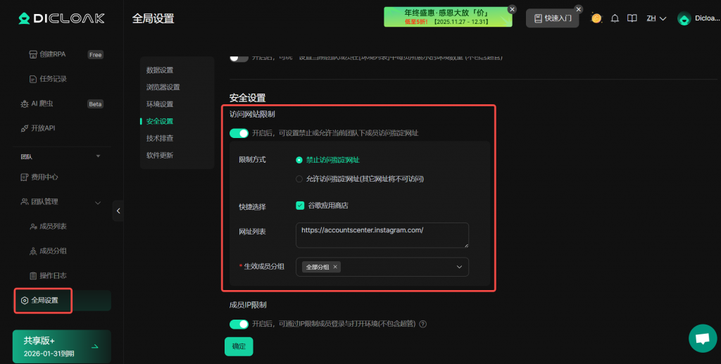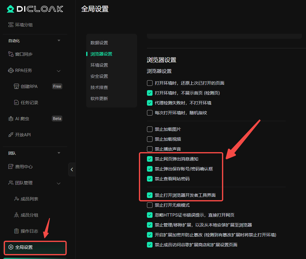 分配对应的成员可使用的浏览器功能,避免成员进行违规的操作,以下是具体的设置: