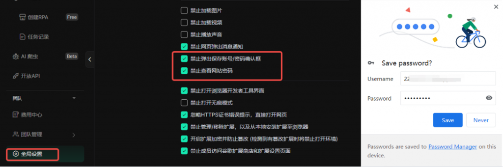 - 开启【禁止弹出保存账号/密码确认框】和【禁止查看网站密码】功能,成员将无法查看、修改、复制具体的账号密码,也无法访问密码管理器