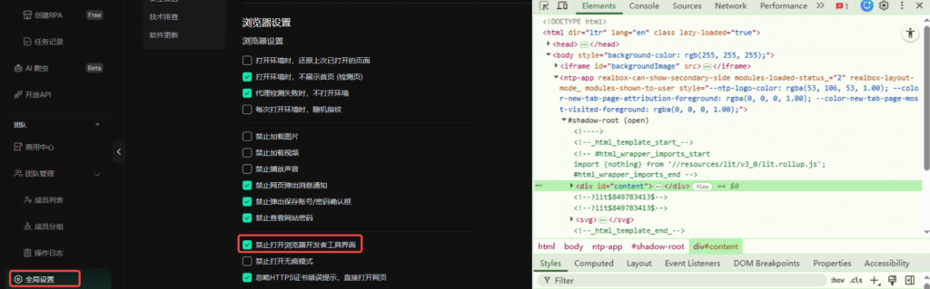 - 开启【禁止打开浏览器开发者工具界面】,成员将无法使用【检查】功能,无法放访问【开发者工具】