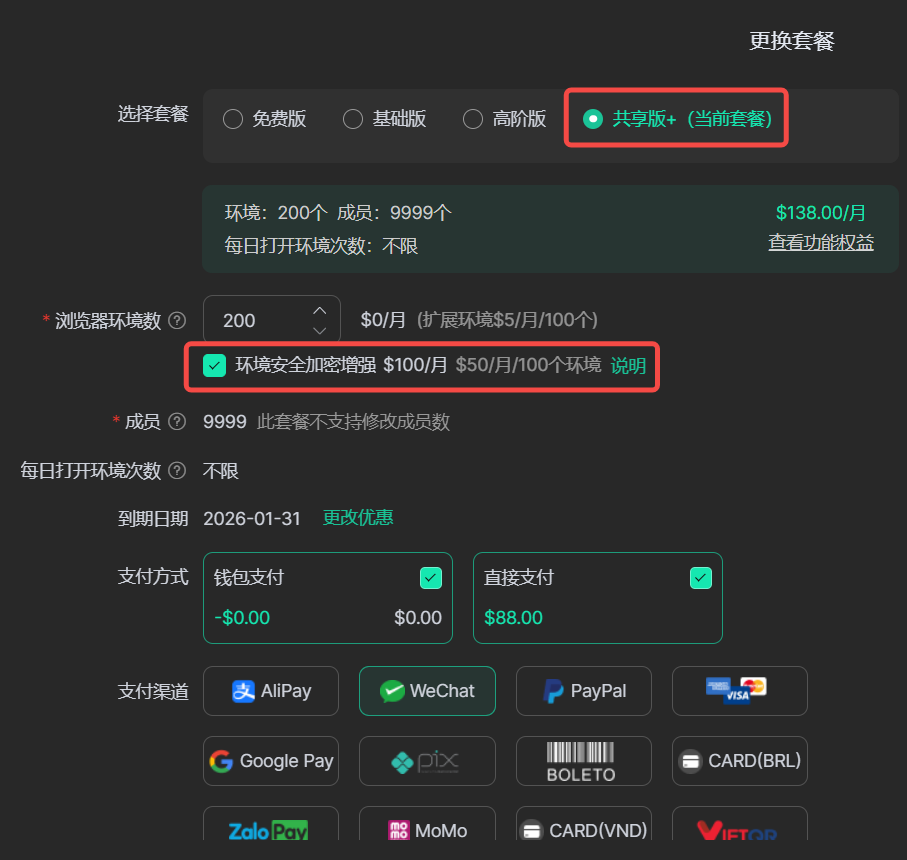该功能仅支持共享版+套餐购买使用,如有需要可进入【费用中心】-【更改套餐】购买。