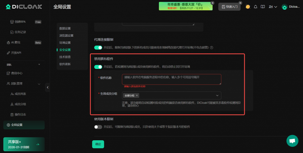 进入【全局设置】-【禁用抓包软件】,可将市面上常见的抓包软件添加至软件名称(软件在任务管理器中显示的名称),避免成员使用抓包软件盗取平台账号信息。