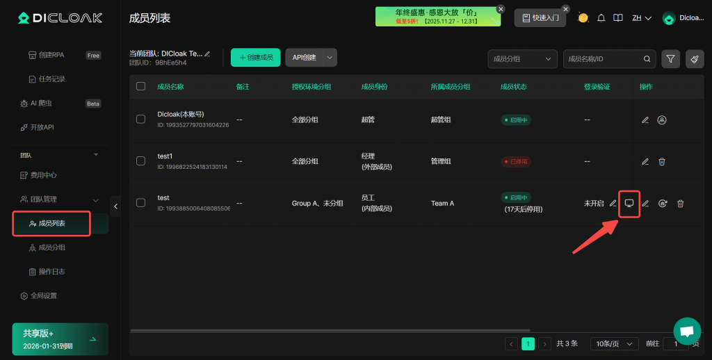 进入团队管理-成员列表,点击“设备”图标,可查看已登录该成员账号的设备,并下线可疑设备