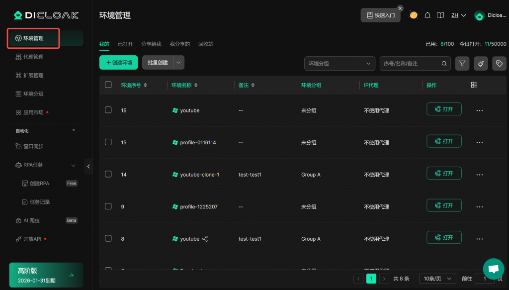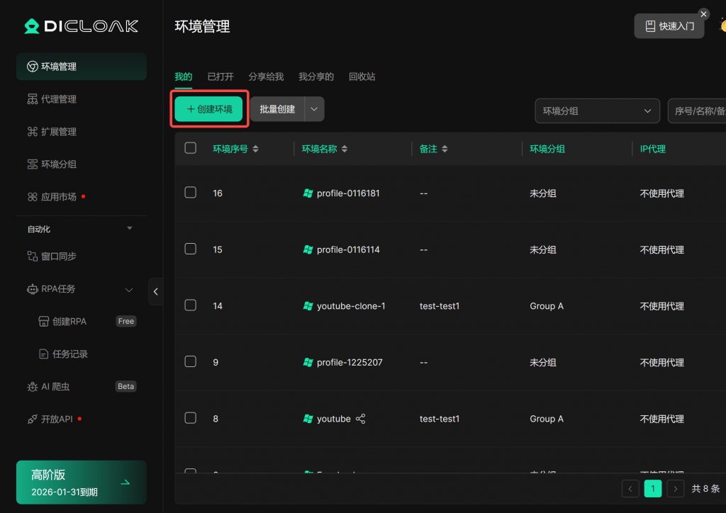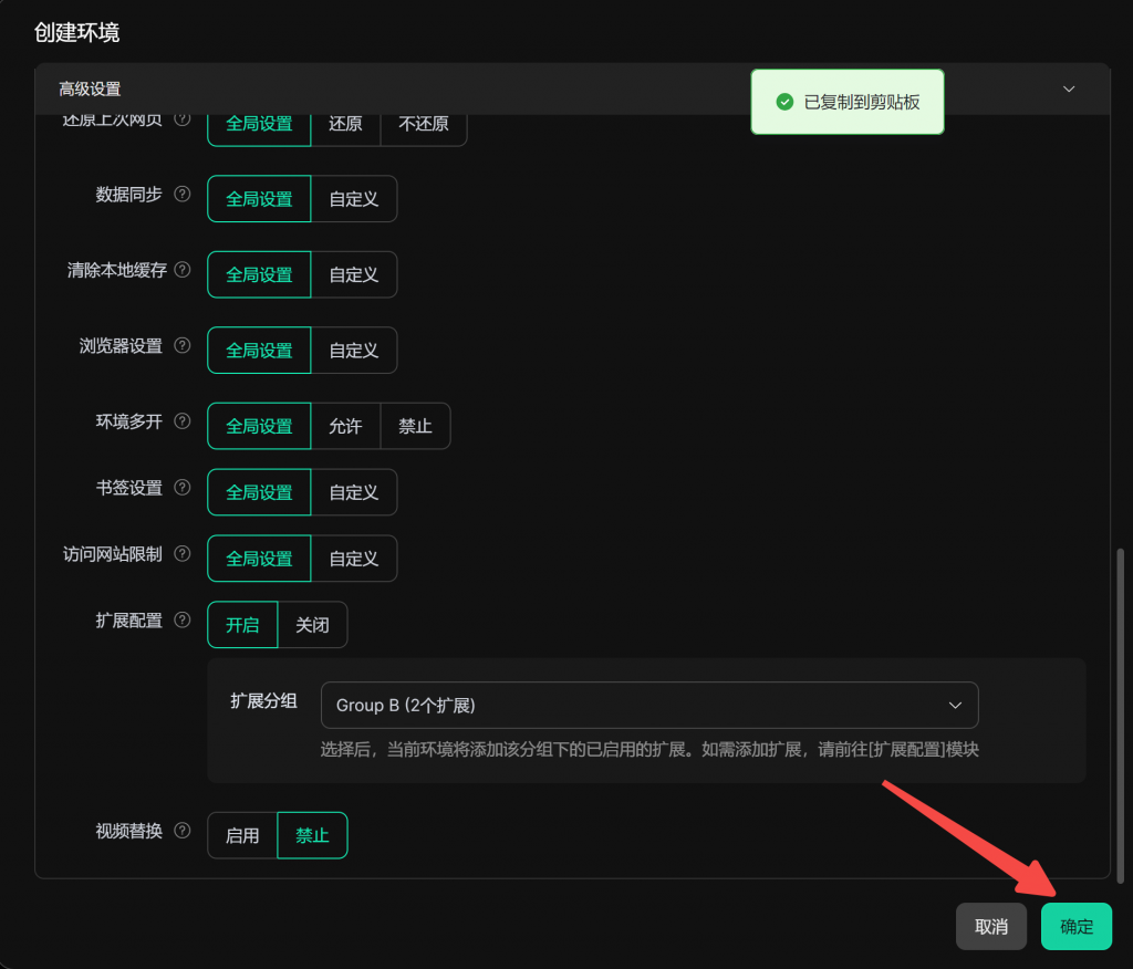 - 完成所有的信息设置后,即可点击【确定】完成浏览器环境的创建。