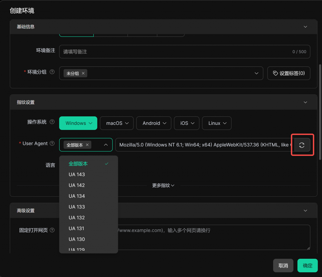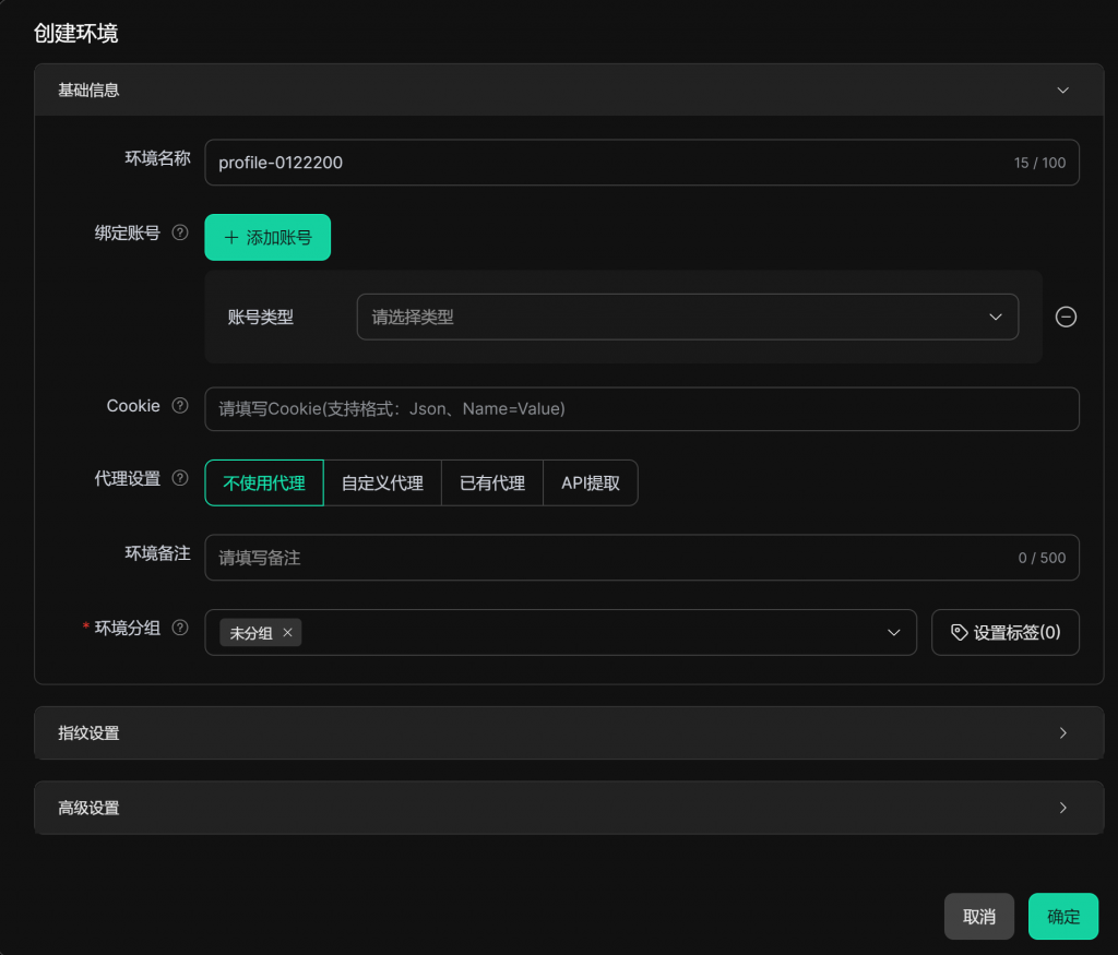 - 环境分组:选择浏览器环境的分组,默认选择【未分组】,您也可创建新的分组。