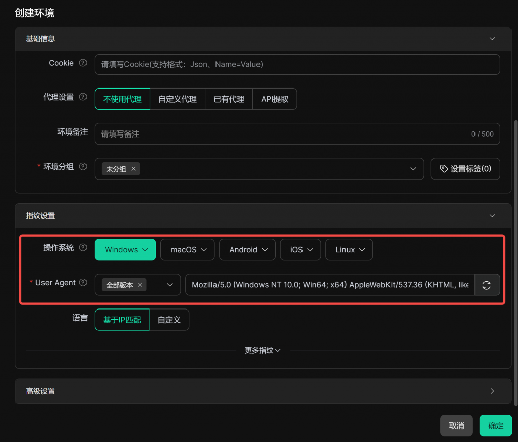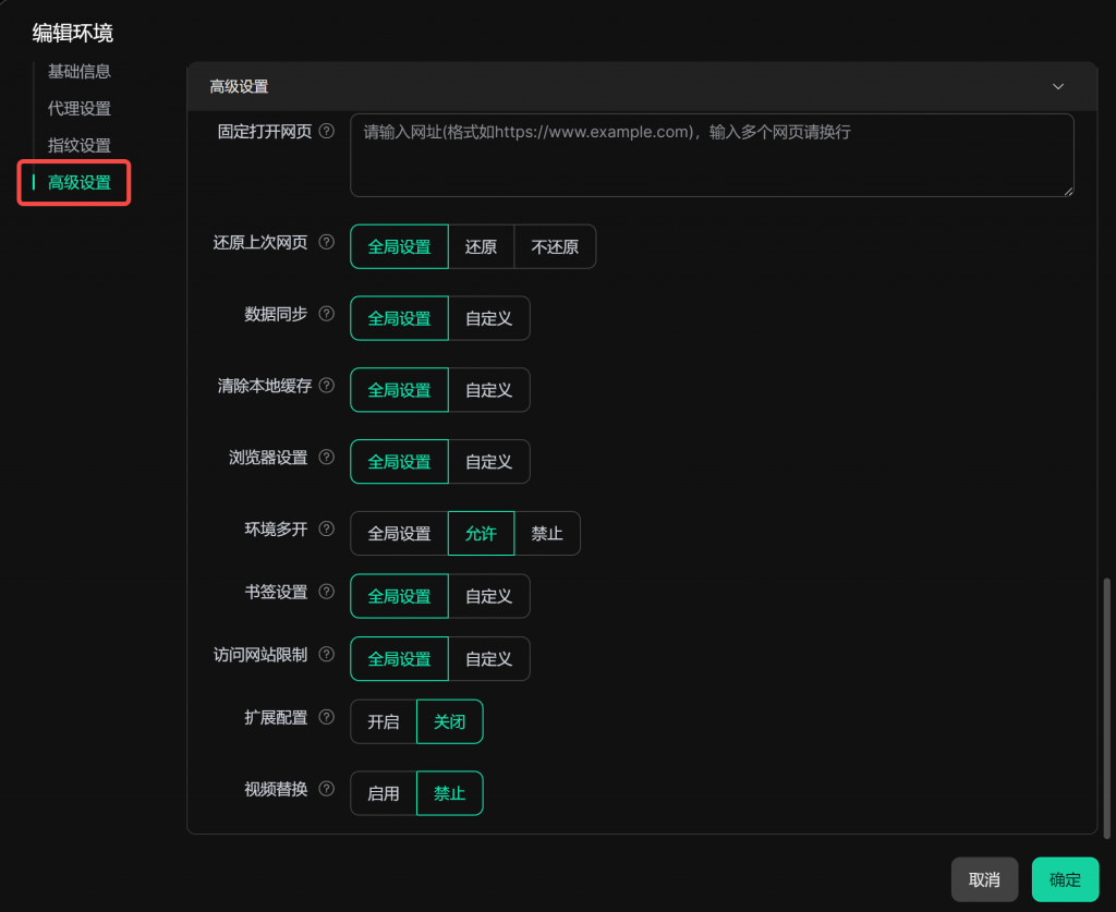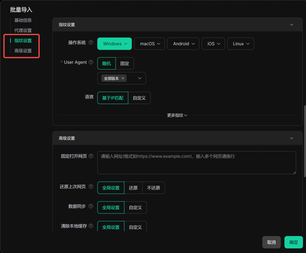 - 【基础信息】与【代理设置】已批量导入,则不需再进行设置,而其它的设置步骤与【单个创建浏览器环境】相同,一般来说默认设置已经可以满足大部分场景需要。您的设置将会应用在所有批量导入创建的环境中。