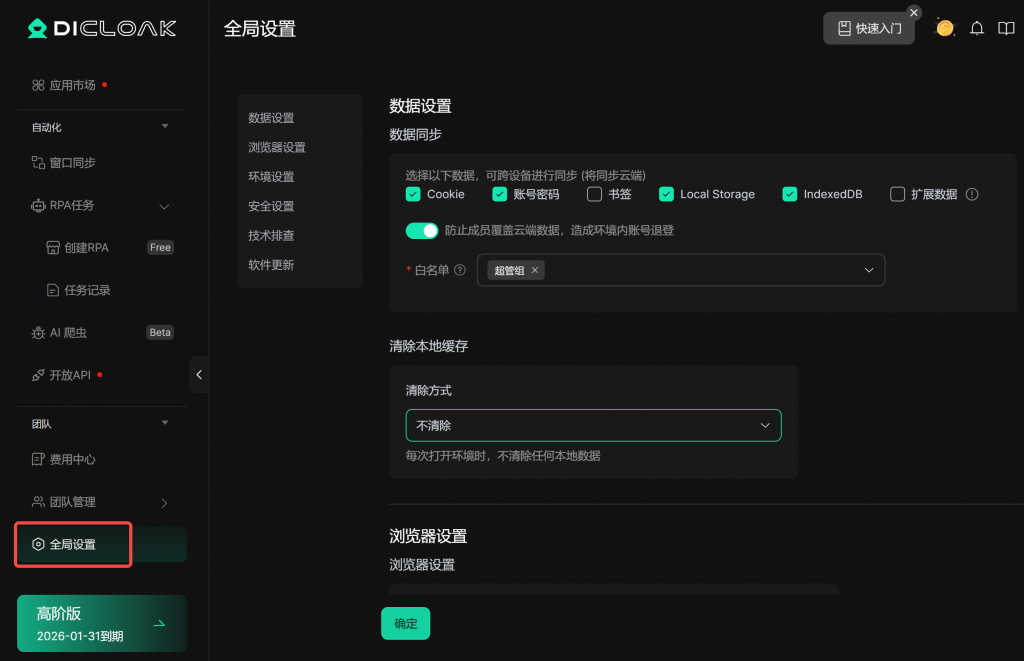 - 另外,【高级设置】分为【全局设置】与【自定义】,选择【全局设置】则对应的设置项会与团队的【全局设置】一致,选【自定义】则可单独为这个浏览器环境设置相关内容。