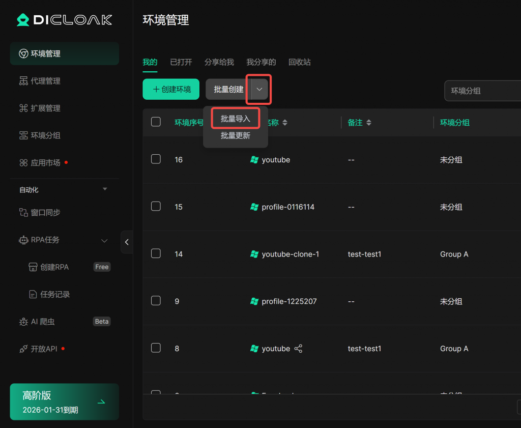 - 环境备注:可选填浏览器环境的备注,便于管理。