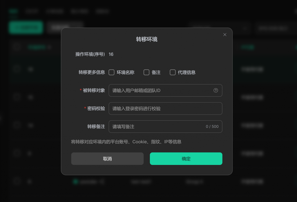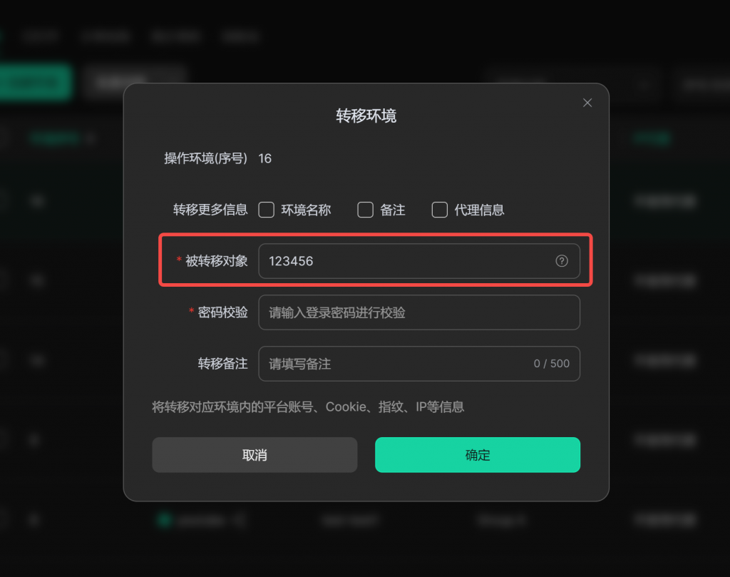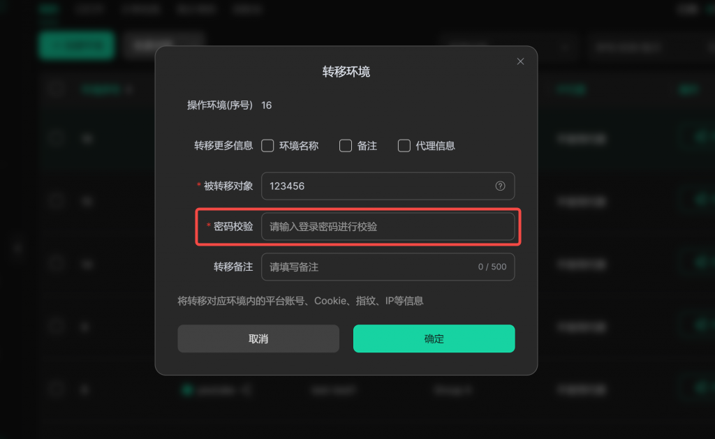 - 输入您当前DIC账号的登录密码进行验证,最终点击【确定】按钮完成环境转移。