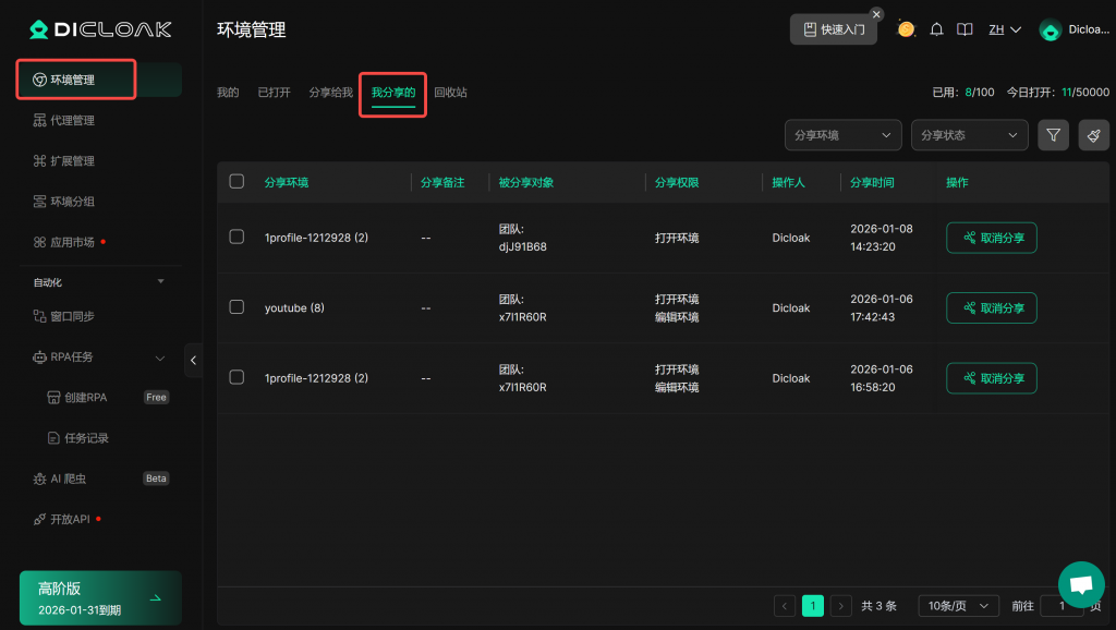 1) 在【环境管理】中,点击【我分享的】即可查看环境分享记录