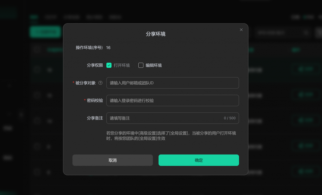 - 分享环境:环境的所有权不变,被分享环境的团队拥有使用权