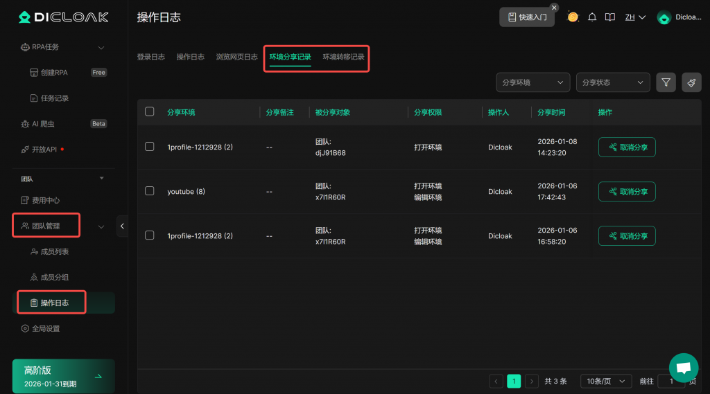 2)进入【团队管理】-【操作日志】,可查看【环境分享记录】和【环境转移记录】。