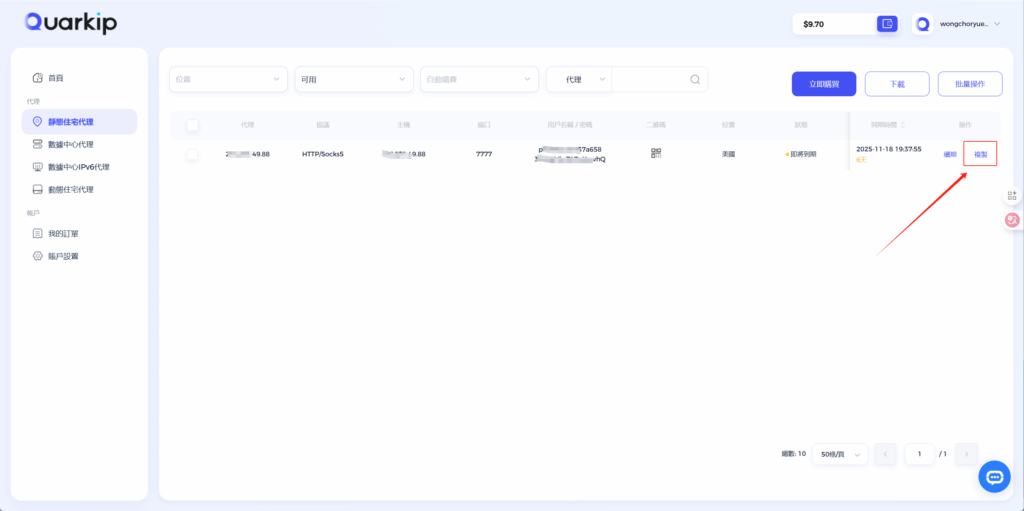 以 QuarkIP 的美國 ISP 代理为例,找到需要添加的代理,复制到 DICloak 进行解析