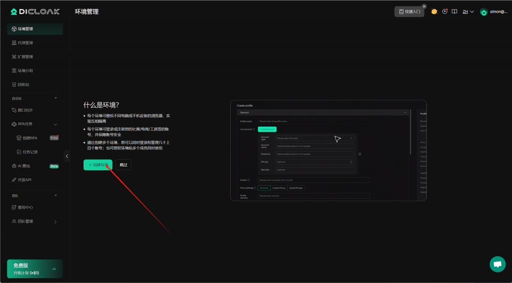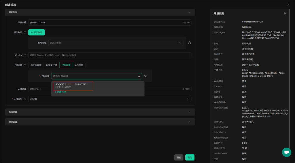 4.代理检测成功后,接下来我们需要创建新的浏览器环境,并在“已有代理”中选择刚刚添加的 QuarkIP 代理,完成相关设置后保存即可使用