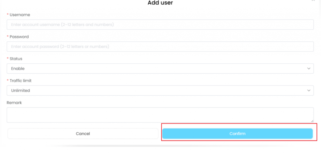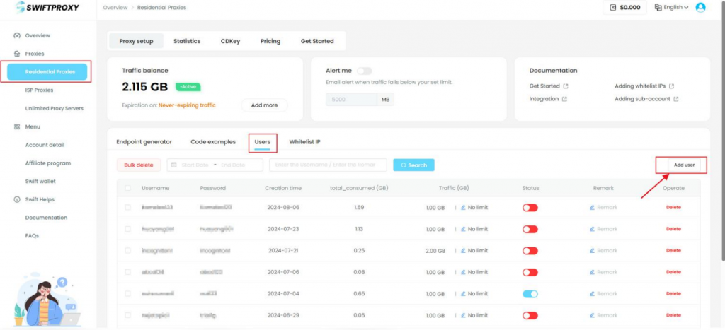 - 登录账户后,点击 “住宅代理”→“用户”→“添加用户”,即可创建子账户。