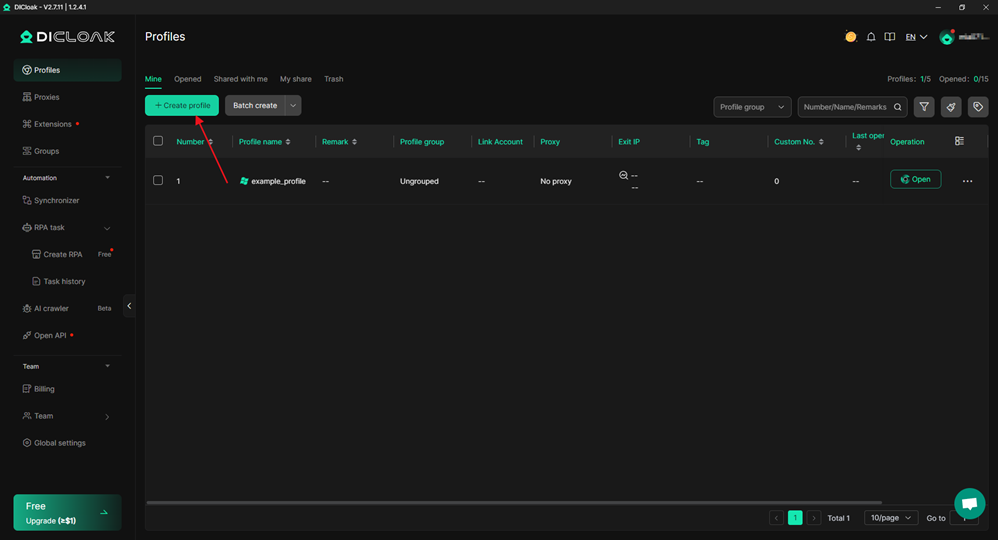 1.打开DICloak反检测指纹浏览器,点击“环境管理”页面的“创建环境”按钮