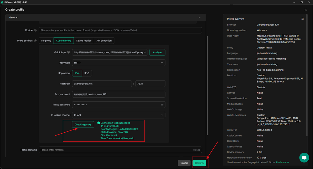4.接下来,根据您的需求配置其他浏览器选项,最后点击 “确认”,完成浏览器创建。